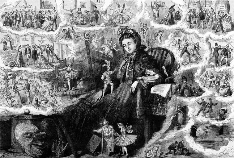 Keywords: sleeping woman vintage antique dream drawing female napping tired resting person girl adult portrait nightmare clown creepy hiding