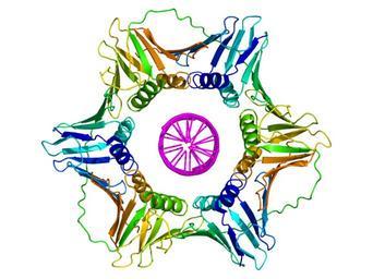 Keywords: Sliding clamp dna complex.png en Complex between human PCNA PDB 1W60; rainbow colored and double stranded B DNA magenta own Boghog Protein structures from PDB