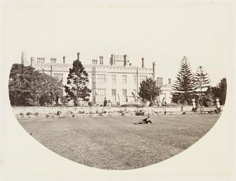 Keywords: SLNSW 479628 125 Government House Front SH 580583.jpg en 125 Government House Front SH 580-583 1872 http //acms sl nsw gov au/item/itemDetailPaged aspx itemID 479628 item <br/>http //acms sl nsw gov au/item/itemDetailPaged aspx itemID 442753 album Pickering Charles Percy New South Wales Government Printing Office This image may be used freely without requesting permission The State Library of New South Wales http //www acmssearch sl nsw gov au/search/itemPopLarger cgi itemID 479628 requests acknowledgement that the image is from the collections of the State Library of NSW Albums 1 album containing 1 sepia 166 albumen photoprints ; 46 5 x 56 8 x 7 8 cm Bequeathed by D S Mitchell 1907 ; Transfer from Mitchell Library Printed Books X981 1/5 in 1985 Out of copyright - Created before 1955 Titles of photographs are printed on album page below image ; Printed on title page Photographs / of / Public and Other Buildings c / Taken by Authority of / The Government of New South Wales / At the request of / The Secretary of State for the Colonies / The negatives were taken by Mr Charles Pickering under the direction of James Barnet Esq Colonial Architect / New South Wales Thomas Richards Government Printer - 1872 A printed contents list follows the title page along with text on the port of Sydney ; Each album page has a protective flyleaf and there is a red-brown border drawn around each photograph ; On most album pages at the lower right of image appears a handwritten SH and a number in pencil This referes to the Government Printing Office file number with SH denoting John Sharkey who possessed a large number of Charles Pickering's negatives -- Reference Alan Clifford Government Printing Office 1985 ; Nos 131-140 were taken from Government House Tower; D S Mitchell signature on title page New South Wales Government Printing Office Clio ship ; Galatea Ship David Scott Mitchell Collection botanical gardens; bridges; cathedrals; churches; courthouses; harbours; islands; mortuaries; observatories; offices; official buildings; post offices; prisons; schools colleges; ships; statues; streetscapes Abattoirs Glebe Island N S W ; Australian Museum Sydney N S W ; Bank of Australasia Sydney N S W ; Darlinghurst Court House Darlinghurst N S W ; Darlinghurst Gaol N S W ; Exhibition Building Prince Alfred Park N S W ; Glebe Island Bridge Sydney N S W ; Government House Sydney N S W ; Lassetter Co 421 George Street Sydney N S W ; Mort's Wool Stores Circular Quay Sydney N S W ; Old Treasury Building Sydney N S W ; Royal Botanic Gardens Sydney N S W ; Stock Exchange Bridge Gresham Streets Sydney N S W ; Victoria Club Sydney N S W Album ID 823409 SLNSW-image 479628 PD-Australia PD-1996 Australia Images from the State Library of NSW album 442753 SLNSW media uploaded by User 99of9 Government House Sydney 1872 in Sydney Photographs by Charles Percy Pickering