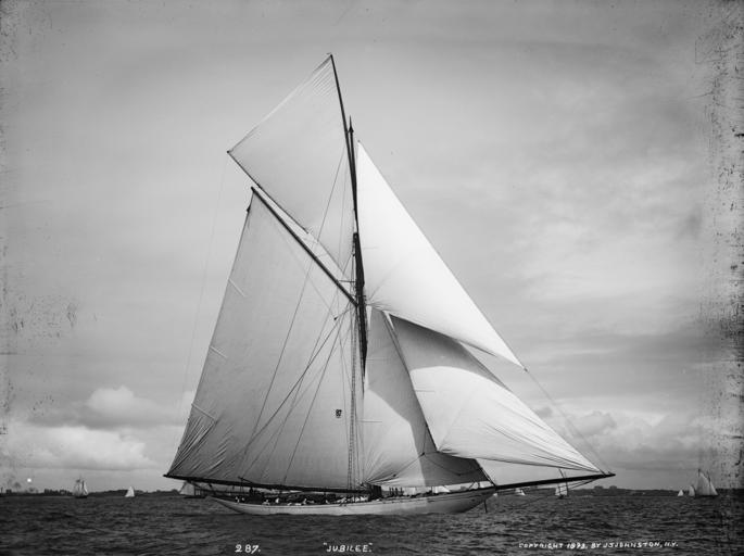 Keywords: Sloop Jubilee-5.jpg Charles Jackson Paine 's sloop Jubilee designed by his son John Bryant Paine and built in 1893 at the George Lawley Son shipyard Massachusetts was a candidate for the 1893 America's Cup defence She featured a fin-bulb keel and two centerboards one forward of the keel after the cutwater and another set inside the finkeel She is pictured here on the day of the Ogden Goelet Cup in Newport RI a drifting match which ended in fog and a comical quiproquo with the flagship committee over which of the four cup contenders had actually won The Jubilee finished third http //query nytimes com/mem/archive-free/pdf res FA0815F63F5A1A738DDDAA0994D0405B8385F0D3 New York Times - Colonia won the Goelet Cup LOC-image det 4a21712 Creator John S Johnston 1893-08-11 PD-Detroit Jubilee ship 1893 Boats under sail Photographs by John S Johnston Black and white photographs |