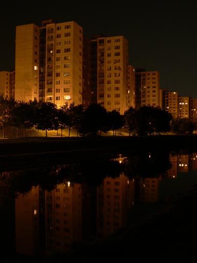 Keywords: slovakia bratislava night megalopolis view reflection buildings apartments water