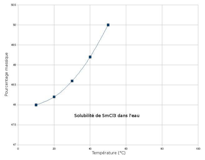 | Keywords: SmCl3 Solubilite dans eau.png fr Solubilité de SmCl3 dans l'eau en fonction de la température Créée par mes soins avec OpenOffice org Calc et The Gimp d'après http //www hbcpnetbase com/ Handbook of Chemistry Physics Epop Check categories 2009 May 2 fr wikipedia Trichlorure_de_samarium Chemistry 2 Samarium III chloride |