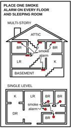 | Keywords: SmokeAlarmPlacement.svg  Diagram of where to put smoke alarms The top caption reads PLACE ONE SMOKE ALARM ON EVERY FLOOR AND SLEEPING ROOM The top diagram is labeled MULTI-STORY with an attic basement two bedrooms a living room and a kitchen The bottom diagram is labeled SINGLE LEVEL and has similar rooms Suggestions for smoke alarms are diagramed SmokeAlarmPlacement jpg 2011-03-15 16 30 UTC SmokeAlarmPlacement jpg U S Consumer Product Safety Commission sponsor ; artist unknown derivative work Malyszkz <span class signature-talk >talk</span> Zwektoryzowano Krzysztof ZajÄ…czkowski SmokeAlarmPlacement jpg PD-USGov Original upload log This image is a derivative work of the following images File SmokeAlarmPlacement jpg licensed with Cc-pd-mark-footer PD-USGov 2007-03-26T08 08 24Z Eubulides 317x574 39633 Bytes <nowiki> Diagram of where to put smoke alarms The top caption reads PLACE ONE SMOKE ALARM ON EVERY FLOOR AND SLEEPING ROOM The top diagram is labeled MULTI-STORY with an attic basement two bedrooms </nowiki> Uploaded with derivativeFX Smoke detectors |