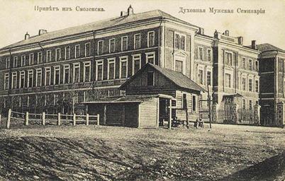| Keywords: Smolensk Seminary 3.jpg en The building of the Smolensk Theological Seminary now owned by the Ministry of Defense and located at a military camp on the street RWC ru Здание Смоленской духовной семина ии ныне п инадлежит инисте ству обо оны и находится на те ито ии военного го одка по улице Реввоенсовета О игинальная отк ытка е установлены before 1917 года PD-RusEmpire 20th-century postcards of Russia Postcards of Smolensk | ||||