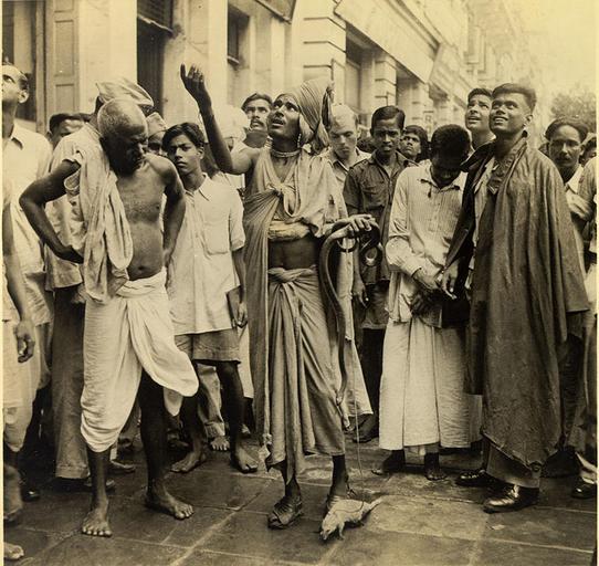 Keywords: Snake charmer in Calcutta in 1945.jpg This weird-looking snake charmer is doing his best to coax a balcony audience to toss down enough baksheesh to get his cobra nad mongoose in the mood to stage a fight to the finish Actually the combatants always seem a bit bored with the act and after a few fierce snorts and lunges decide it is better to live The South Asia Section of the Van Pelt Library University of Pennsylvania recently acquired from a bookdealer a photograph album consisting of 60 photographs of Calcutta taken most likely between 1945-1946 The photographer Mr Clyde Waddell also provided the interesting glosses accompanying each photograph Several attested copies of this work has emerged including one with a 'title page' held by the Southeastern Louisiana University in Hammond Louisiana Mr Waddell was a military photographer Many of his captions sound like annotations that would be found in a typical military magazine The album begins with several general long shots of Calcutta and ends with a picture of dhobi-s washermen washing clothes The text accompanying the last photograph also sounds as if the author intended to finish with that picture of one of the great mysteries of India The annotations have been included because of their intrinsic interest not only to the photographs but to a 'typical' American impression of India at this time 1945 http //www library upenn edu/collections/sasia/calcutta1947/ Clyde Waddell other versions PD-USGov Van Pelt Library University of Pennsylvania - Clyde Waddell Calcutta 1940's photos Uploaded with UploadWizard Snake charmers in India |