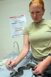 Keywords: Snake Surgery DVIDS279943.jpg en Army Sgt Jamie Murphy animal care non-commissioned officer in-charge of the Guantanamo Bay Veterinary Treatment Facility holds a two-year-old Cuban Boa snake before inserting a tracking chip April 13 The clinic treats the pets of service members and Department of Defense employees assigned to Joint Task Force Guantanamo and U S Naval Station Guantanamo Bay 2010-04-13 Petty Officer 3rd Class Joshua Nistas https //www dvidshub net/image/279943 100413-N-+++++-056 2010-05-17 16 25 GUANTANAMO BAY CU PD-USGov-Military-Navy Naval Station Guantanamo Bay Joint Task Force Guantanamo Images from DoD uploaded by Fæ |