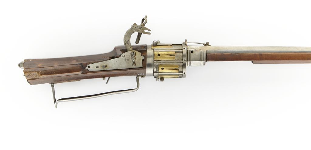 | Keywords: Snapplåsbössa av revolvertyp, 1585 cirka - Skoklosters slott - 103453.tif LSH artwork Hans Stopler Stapler bössmed stockmakare sv 1710 års inventarium p 4 rum I 44-142-1 Byssa som giör 8 skått i een laddning med flintlåås <br/>Åttkantig slätborrad pipa av stål Siktbleck av stål fastskruvat med<br/>skruv vars huvud är vingformigt och försett med siktskåra Knoppkorn<br/>med mässing Pipans bakre del förstärkt och vidgad i form av spetsrörka <br/>Från denna del går en 340 mm lång axel av stål på vilken kammare och<br/>kolv är uppträdda <br/>Rullande kammare med plats för åtta krutladdningar På utsidan 7 skjut-<br/>lock av mässing med knappar av stål samt ett lock av stål under vilka<br/>fängkruthålen döljs Bakom kammaren ett separat runt lock i vilket<br/>kolven träs in Insidan av detta lock med graverad dekor <br/>Snapplås På låsblecket stämpel med sporre Stöckel nr 5897 Nyrnberg <br/> ca 1570- ca 1600 liknar Hans Stolpers stämplar 1054 1055 <br/>Böjd hane med lös överkäke - hanfoten på låsets insida studel och<br/>skruv på utsidan Hela mekanismen i övrigt invändig U-formig slagfjäder<br/>vilken verkar på klack på hanens baksida Hjullåsavtryckare <br/>Hel stock av brunt trä Tysk kolvtyp Bakplåt av horn Avskruvbar<br/>stödkula vilken griper in i stålaxeln Tresidigt kolvlådelock På<br/>anslaget springande hjort av ben En låsskruv med rund benbricka <br/>Två pipstift med profilerade benbrickor Trågformig s k holsteinsk<br/>varbygel <br/>Utan tillbehör <br/>Märkt 142 ovanför låsblecket stanstyp 5376 original caption Snapplåsbössa av revolvertyp 1585 cirka <br/> Nyckelord 1500-tal Snapplåsbössa Vapen Gevär Föremålsbild 4quarter other date century 16 size mm 1010 size mm 668 pipa size mm 90 SKO Carl Gustaf Wrangel place of origin original filename sm_dig14507 27368 inventory number SKO 6070 103453 CC-BY-SA Erik Lernestål 16th century Snaplock firearms Revolvers Erik Lernestål Media contributed by LSH dim-with multiple size templates Media contributed by LSH unmatched creator Media contributed by LSH 2015-11 |