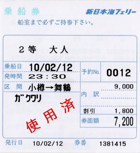 Keywords: SNF OtaruMaizuru.jpg en Ticket of Japanese ferry SHinnihonkai ferry co ltd From Otaru port To Maizuru port ja 新日 海フェリーの乗船券 小樽港発 舞鶴港行 2等・大人・学割 Used by MaksimTack MaksimTack 2010-02-12 Shinnihonkai Ferry Ferry tickets of Japan