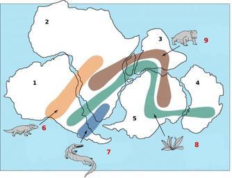 | Keywords: Snider-Pellegrini Wegener fossil map-i18n.png Internationalization of the diagram Snider-Pellegrini-Wegener-fossil-map<br> 1-South-America<br> 2-Africa<br> 3-India<br> 4-Australia<br> 5-Antarctica<br> 6-Fossil remains of Cynognathus a Triassic land reptile approximately 3m long <br> 7- Fossil remains of the freshwater reptile Mesosaurus<br> 8-Fossil of the fern Glossopteris found in all of the southern continents show that they were once joined<br> 9-Fossil evidence of the Triassic land reptile Lystrosaurus<br> http //wrgis wr usgs gov/docs/parks/pltec/pangea html USGS/USA-Gov modified by Eurico Zimbres Free for all use Maps of past tectonic plates Triassic geography Lystrosaurus Glossopteris PD-USGov Mesosaurus Fossils of India |