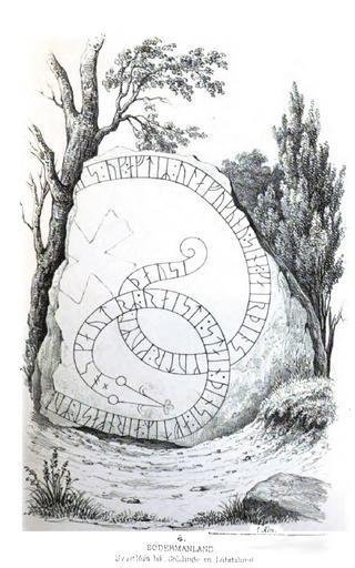 Keywords: Sö 296, Lövstalund.jpg 10002402800001 The runestone Sö 296 The inscription reads × oskautrR raisti stain þinsi aftiR airnfast mu uþur sin sun kuþi k s uk aftiR ulafu kunu sina kairþi oskutr kuml þausi + In English Ásgautr raised this stone in memory of Ernfastr his mother's brother Gyðingr's son and in memory of Ólôf his wife Ásgautr made these monuments Dybeck Richard 1855 Svenska run-urkunder Första Samlingen Stockholm Joh Beckmann 1855 Richard Dybeck Author died more than 70 years ago - public domain PD-old DEFAULTSORT Sö296 Runestones Södermanland Runestones of Botkyrka Municipality Grödinge socken |
