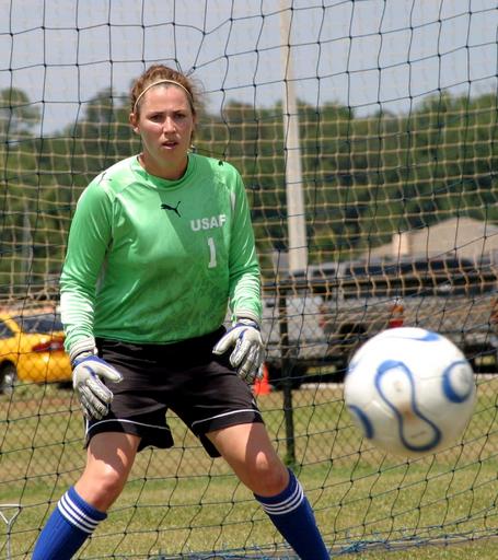 Keywords: soccer football goalie sport college uniform ball team field grass stadium match player female