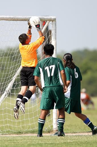 Keywords: soccer goalie goal tender game competition ball sport football match play team competitive playing keeper soccer goal youth league action jumping goal keeper yellow grass soccer pitch football pitch save outdoors jump foot field athlete