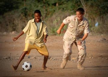 | Keywords: Soccer in Djibouti.jpg  11/20/06 - U S Navy Lieutenant Commander Wendy Halsey with Combined Joint Task Force - Horn of Africa plays soccer with a Djiboutian boy at an orphanage in Djibouti City Djibouti on November 20 2006 Halsey's friends and family collected more than 300 soccer balls from churches schools and organizations throughout the United States for donation to schools and orphanages throughout the Horn of Africa U S Department of Defense photo by Chief Eric A Clement U S Navy Released 061120-N-1328C-142 U S Deaprtment of Defense 2006-11-20 Eric A Clement U S Navy PD-USGov PD-USGov Combined Joint Task Force - Horn of Africa Non-professional association football Orphans People of Djibouti Women in the United States Navy 2006 in association football Taken with Nikon D2X |
