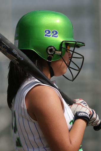 Keywords: softball player female game bat helmet athlete sport girl play batter hitter green uniform outdoor