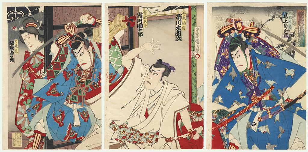 | Keywords: Soga Brothers Surprising Suketsune, 1890.png en Dramatic kabuki scene from the famous tale of the Soga Brothers whose lifelong quest was to avenge the death of their father at the hands of the nobleman Suketsune Here the pair surprises Suketsune in his hunting camp at the foot of Mt Fuji Woken from his sleep the murderer tosses his pillow at Soga Goro while reaching for his sword Goro grips his sword overhead with both hands wearing his trademark robe patterned with butterflies over his armor His older brother Juro approaches at right staring at his enemy with a look of pure disdain His kimono features birds in flight At far left Juro's lover the courtesan Oiso no Tora peers around the corner smiling happily Rain falls heavily against the gray night sky behind her Onoe Kikugoro plays Soga Juro A handsome design with fine embossed detail in Suketsune's white kimono and burnishing in the black court caps and lacquer framing around the wooden panel Artist - Kunichika 1835 - 1900 1890 Joseph Richardson's Private Collection Artist Kunicika other versions Artist Toyohara Kunichka PD-old-70-1923 Prints from Japan |
