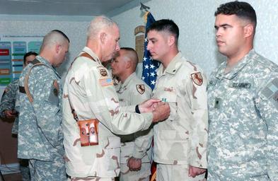 | Keywords: Soldiers awarded for valor, injuries DVIDS10737.jpg en CAMP LIBERTY IRAQ -- Lt Gen John R Vines commanding general Multi-National Corps - Iraq presents Spc Michael Nalker from Jackson Miss of 1st Squadron 11th Armored Cavalry Regiment with the Army Commendation Medal Sept 28 for bravery under fire during Operation Iraqi Freedom Nalker's unit was hit by and Improvised Explosive Device August 13 Military records indicate that Nalker performed well above his level of training by helping an injured Soldier by administering first aide on the scene U S Army photo by Staff Sgt John R Rozean 2005-10-07 https //www dvidshub net/image/10737 10737 2005-10-07 13 21 PD-USGov Camp Liberty Images from DoD uploaded by Fæ |