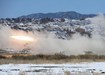 Keywords: Soldiers fire rocket from M142 High Mobility Artillery System