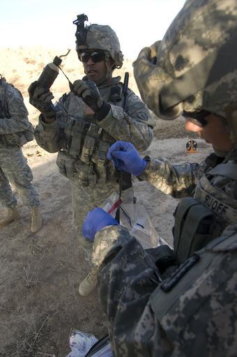 | Keywords: Soldiers in Baqubah DVIDS142508.jpg en U S Army Staff Sgt Lashawn Lenore and Petty Officer 2nd Class Richard Ruoff take samples from items found in a weapons cache U S Soldiers from the Chemical Biological Radiation Nuclear/Weapons Intelligence Team Platoon Brigade Troops Battalion 1st Stryker Brigade Combat Team 25th Infantry Division are exploiting a weapons cache found by 25th Infantry Division Soldiers while conducting a patrol south of Baqubah Iraq on Jan 3 2009-01-03 left https //www dvidshub net/image/142508 090103-N-+++++-026 2009-01-08 19 29 BAQUBAH IQ PD-USGov-Military-Navy 25th Infantry Division United States Images from DoD uploaded by Fæ |