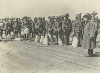 Keywords: soldiers men outdoor Photograph by Josiah Barnes of soldiers waiting to board a troopship. Photographic print on paper. The black and white photograph depicts a group of soldiers on a wharf waiting to board a WW1 troopship. They stand in line with their kit bags, the soldiers toward the back of the line have musical instruments, including a piano accordian and a trumbone. An officer stands at right holding a white cane. The soldier toward the back of the line holds his kitbag which reads: 'V. V 3951'. This man is probably Vere Vains (MM) of the 23 Infantry Battalion who departed Melbourne on HMAT Warilda on 8 February 1916. Josiah Barnes' two sons, Norm and Victor, left for war in 1916 (both returned to Australia after their service). Barnes appears to have taken an interest around this time in photographing the troopships as they departed for war from Melbourne. The Australian National Maritime Museum undertakes research and accepts public comments that enhance the information we hold about images in our collection. If you can identify a person, vessel or landmark, write the details in the Comments box below. Object number: 00027624 Photograph by Josiah Barnes of soldiers waiting to board a troopship. Photographic print on paper. The black and white photograph depicts a group of soldiers on a wharf waiting to board a WW1 troopship. They stand in line with their kit bags, the soldiers toward the back of the line have musical instruments, including a piano accordian and a trumbone. An officer stands at right holding a white cane. The soldier toward the back of the line holds his kitbag which reads: 'V. V 3951'. This man is probably Vere Vains (MM) of the 23 Infantry Battalion who departed Melbourne on HMAT Warilda on 8 February 1916. Josiah Barnes' two sons, Norm and Victor, left for war in 1916 (both returned to Australia after their service). Barnes appears to have taken an interest around this time in photographing the troopships as they departed for war from Melbourne. The Australian National Maritime Museum undertakes research and accepts public comments that enhance the information we hold about images in our collection. If you can identify a person, vessel or landmark, write the details in the Comments box below. Object number: 00027624 |