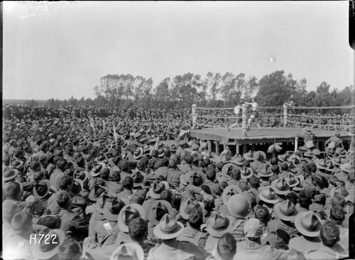 Keywords: the great war thegreatwar great war greatwar world war one worldwarone world war i worldwari wwi first world war firstworldwar new zealand expeditionary force newzealandexpeditionaryforce nzef boxing boxers soldiers authie blackandwhite monochrome crowd people black and white A large crowd of World War One soldiers watching two boxers sparring in a ring, during the boxing championships at the New Zealand Divisional Sports at Authie, France. Photographed by Henry Armytage Sanders on 23 July 1918. Inscriptions: Inscribed - Photographer's title on negative -bottom left: H722. Quantity: 1 b&w original negative(s). Physical Description: Dry plate glass negative 4.75 x 6.5 inches Soldiers watching a boxing match at the New Zealand Divisional Sports, Authie. Royal New Zealand Returned and Services' Association :New Zealand official negatives, World War 1914-1918. Ref: 1/2-013326-G. Alexander Turnbull Library, Wellington, New Zealand. natlib.govt.nz/records/22794581 A large crowd of World War One soldiers watching two boxers sparring in a ring, during the boxing championships at the New Zealand Divisional Sports at Authie, France. Photographed by Henry Armytage Sanders on 23 July 1918. Inscriptions: Inscribed - Photographer's title on negative -bottom left: H722. Quantity: 1 b&w original negative(s). Physical Description: Dry plate glass negative 4.75 x 6.5 inches Soldiers watching a boxing match at the New Zealand Divisional Sports, Authie. Royal New Zealand Returned and Services' Association :New Zealand official negatives, World War 1914-1918. Ref: 1/2-013326-G. Alexander Turnbull Library, Wellington, New Zealand. natlib.govt.nz/records/22794581 |