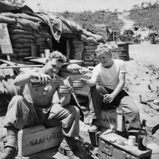 | Keywords: remembrance day remembranceday armistice day armisticeday men man people war conflict sand sand bag sandbag recreation drink pour cigarette blonde t-shirt tshirt naafi watch dirt road korean war koreanwar korea asahi commons blackandwhite monochrome outdoor black and white ID Number: HOBJ3241 Maker: Hobson, Phillip Oliver Place made: Korea Rights Info: No known copyright restrictions. This photograph is from the Australian War Memorial's collection www.awm.gov.au Persistent URL: cas.awm.gov.au/photograph/HOBJ3241 ID Number: HOBJ3241 Maker: Hobson, Phillip Oliver Place made: Korea Rights Info: No known copyright restrictions. This photograph is from the Australian War Memorial's collection www.awm.gov.au Persistent URL: cas.awm.gov.au/photograph/HOBJ3241 ID Number: HOBJ3241