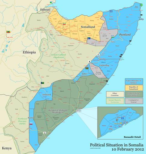 | Keywords: Somalia map states regions districts febr 2012.png en This map shows the states regions and districts of Somalia as well as the current situation in Somalia February 2012 Khatumo State had been proclaimed 2012-02-10 own Ingoman James Dahl Uploaded with UploadWizard Maps of Somali Civil War |