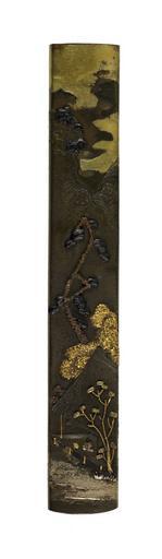 | Keywords: Someya Tomonobu - Kozuka with a Scholar's Hut - Walters 51660.jpg This composition is oriented vertically with a stream at the bottom away from the blade A scholar sits in a hut Behind the hut is a pine tree and a mountain landscape A full moon can be seen behind clouds near the mountains A scholar in the mountains is a common trope in Chinese painting that was adopted in Japanese painting as well 1st half Other date century 19 late Edo shibuichi cm 9 6 l accession number 51 660 10650 Henry Walters Baltimore date and mode of acquisition unknown Walters Art Museum Henry Walters Acquired by Henry Walters Signature Someya Tomonobu place of origin Edo present-day Tokyo Japan Walters Art Museum license Kozuka in the Walters Art Museum Media contributed by the Walters Art Museum needs category review Someya Tomonobu |