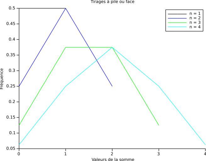 | Keywords: Somme n tirages pile ou face 1 a 4.svg fr Fréquence d'apparition d'une valeur pour la somme de n tirages à pile ou face Illustration du théorème central limite Créé avec Scilab modifié avec Inkscape en Frequency of occurrence of values for the sum of n coin flippings Illustration of the central limit theorem Created with Scilab modified with Inkscape 2013-06-18 11 08 33 own Cdang cdang Scilab source <source lang scilab > // Trace la fonction de densité de la moyenne de n tirages à pile ou face clear; clf; nbmax 4; // nombre max de tirages function frequences tirages n // calcule les fréquences de n tirage à pile ou face par dénombrement // entrées n nombre de tirages entier // sorties frequences matrice de fréquences réels N 2 n; // nombre de valeurs possibles resultats zeros N n ; // initialisation résultats des tirages for i 1 n // n° de colonne k 2 n - i ; //à la colonne i on alterne k valeurs 0 et k valeurs 1 for j 0 2 i - 1 - 1 resultats 2 j k + 1 2 j + 1 k i 0; resultats 2 j + 1 k + 1 2 j + 2 k i 1; end end //disp resultats ; somme sum resultats c ; frequences_non_triees tabul somme ; frequences gsort frequences_non_triees lr i ; frequences 2 frequences 2 /N; // normalisation des fréquences endfunction // Programme principal for i 1 nbmax XY tirages i ; plot2d XY 1 XY 2 style i end axe gca ; xtitle Tirages à pile ou face Valeurs de la somme Fréquence legend n 1 n 2 n 3 n 4 </source> cc-zero Uploaded with UploadWizard Coin flipping Central limit theorem |