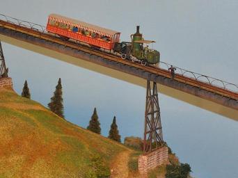 Keywords: Sonderausstellung Bergbahnen - 02.jpg Model railway diorama show the Vitznau-Rigi Kulm railway the former Vitznau-Rigi railway original Rigi railway RB current Rigi railways RB at the temporary Swiss mountain railways special exhibition in the Hünegg Castle by lake Thun in the Bernese Oberland in the summer of 2012 and 2013 The diorama represents the filigree lattice-truss bridge of Schnurtobel in the HO scale at 1 87 scale ration on HO gauge between Mittlerschwanden and Grubisbalm in original version In the centre of diorama the steam locomotive H 1/2 number 7 with for the locomotive initially used typical vertical boiler in accompany with en compartment coach Sonderausstellung Bergbahnen im Schloss Hünegg am Thunersee in der Schweiz im Sommer 2012 gezeigtes Diorama der Bahnstrecke Viznau-Rigi Kulm der ehemaligen Vitznau-Rigi-Bahn ursprünglich Rigibahn RB heute Rigi Bahnen RB Das Diorama wiedergibt die filigranten Gitterträger Brücke den Schnurtobelviadukt in der Nenngrösse H0 im Massstab 1 87 in der Spur H0 zwischen Mittlerschwanden und Grubisbalm im Originalzustand Auf dem Diorama die Dampflokomotive H 1/2 Nummer 7 mit dem ursprünglich wie auch heute für die Originallokomotive typischen stehendem Dampflokomotivkessel und ein dazugehörender Abteilwagen chemins de fer du Rigi actuels RB exposée à l ™exposition temporaire des chemins de fer de montagne au château de Hünegg au bord du lac de Thoune en Suisse à l'été de 2012 et 2013 Le diorama représente le filigrane pont en treillis de Schnurtobel à l'échelle H0 au rapport de réduction de 1 87 avec une voie H0 entre Mittlerschwanden et Grubisbalm en version originale Dans le centre du diorama la locomotive à vapeur H 1/2 numéro 7 en version original typique avec la chaudière verticale avec un wagon à impériale own Schönegg 2012-09 Siehe auch http //www modellbau-wiki de/wiki/Bild Sonderausstellung_Bergbahnen_-_02 jpg Bild Sonderausstellung Bergbahnen - 02 jpg auf dem Modellbau-Wiki www modellbau-wiki de H0 scale Models of rack railways VRB H 1/2 2-2-0T locomotives Vertical boilered steam locomotives Steam engines with Allan straight link valvegear SLM standard gauge steam locomotives Schnurtobelviadukt Sonderausstellung Bergbahnen im Schloss Hünegg