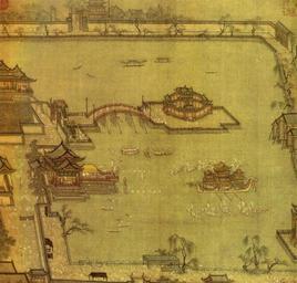 | Keywords: Song-Imperial-Garden1.jpg Games in the Jinming Pool by Chinese artist Zhang Zeduan a silk painting with dimensions of 28 6 by 28 5 cm dated to the Northern Song Dynasty 960-1127 AD It depicts the imperial gardens of Kaifeng the capital city of China during the Northern Song era Source Uploaded 11 February 2006 Creator Zhang Zeduan PD-old-100 Architecture in art Bridges in art Ponds in art Gardens in art Boats in art Paintings of the Song Dynasty PD China Paintings on silk | ||||