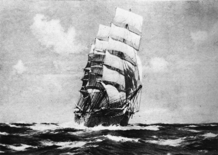 | Keywords: Sophocles - StateLibQld 70 170548.jpg en Sophocles 1138 tons was the smallest iron clipper built in 1879 Sister to the ship Cimba both were regular Sydney traders The Sophocles was sold to Italian owners and was still afloat in 1926 under the Italian flag <br /> Black and white photograph of a painting by Jack Spurling handle 10462/deriv/105672 is held by John Oxley Library State Library of Queensland Jack Spurling 1870-1933 StateLibQld-License PD-Australia Historical images of square-riggers under sail Sophocles ship 1879 Sailing ships in art Paintings by Jack Spurling Black and white reproductions of paintings in color |