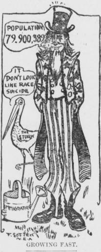 | Keywords: Sottek cartoon about American demographics being affected by immigration.jpg Uncle Sam and the Stork Storks and childbirth stork discuss the effect of immigration embodied by a watering can on the demographics of the United States Uncle Sam proudly states the national population 79 900 389 in 1904 while the stork points out that this is not race suicide 1904-04-25 http //chroniclingamerica loc gov/lccn/sn88085187/1904-04-25/ed-1/seq-4/ The Tacoma Times Creator Frank Sottek other versions Custom license marker 2015 08 04 PD-old-auto-1923 1935 Uploaded with UploadWizard Cartoons by Frank Sottek Uncle Sam Images from The Tacoma Times |