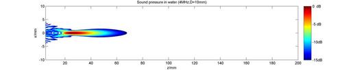 Keywords: Soundfield Water 4MHz TransducerRadius5mm Focus30mm.png en Soundfield of a focused ultrasound transducer f 4MHz D 10mm aperture R 30mm curvature radius water own Michael Lenz date Ultrasonic transducers