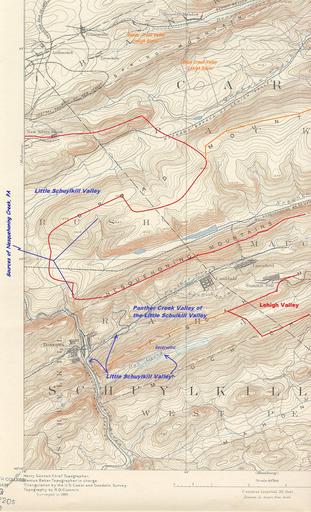 | Keywords: Sources of Nesquehoning creek from hzlt93sw map excerpt, drainage divides antd-en.jpg en Re-rotated unrotated re-upload of File Sources of Nesquehoning creek from hzlt93sw-Rot90cw JPG bullR This map serves the same function but with the sources of the Nesquehoning written sideways This version is heavily annotated not only with red lines signifying the tops of drainage basins the drainage divides between the Lehigh River basin and the Little Schuylkill River basin in the Ridge-and-Valley Appalachians barrier ridge folded landform landscapes but orange lines to show divides between creek tributaries within the same drainage/river system <br/> bullR This version's annotations label various valleys of subordinate drainage divides such as Beaver Creek Black Creek and the historic Panther Creek Valley like about half the streams shown here cutting through the border in between Carbon and Schuylkill Counties <hr/> bullR This orientation is useful for displaying the complex drainage basin s and especially the ridges with the drainage divides involving two counties above the historic Anthracite coal mining and rail transport railroad communities of <br> Weatherly PA Beaver Meadows PA Delano PA Hometown PA Tamaqua PA Coaldale PA Lansford PA and extremely influential in the bootstrapping of United States the U S Industrial Revolution ---- Tamaqua co-ords 40° 47 ² 55 ³ N 75° 57 ² 59 ³ W 40 798611 -75 966389 Broad Mountain Lehigh Valley Broad Mountain co-ords 405343N 0754944W Tower Carbon County Pennsylvania 405435N 0754824W Northern Peak Carbon County 404649N 0760838W Southern Peak Schuylkill County Pennsylvania 2016-09-10 USGS cc-zero Fabartus PD-USGov other versions thumb unannotedthumb Orignal uploaded version rotated 90 degreesSee text links bullR Un-annotated version File Sources of Nesquehoning creek from hzlt93sw map excerpt jpg bullR See also Modern mixed mode topo+shaded relief map covering many of the same terrains File USGS relief-Broad Mountain and Terrains it dominates west of the Lehigh Gorge and north of Tamaqua Nesquehoning and Jim Thorpe PA png Nesquehoning 1 1893 maps of Pennsylvania Landforms of Carbon County Pennsylvania Landforms of Luzerne County Pennsylvania Landforms of Schuylkill County Pennsylvania Nesquehoning Creek Ridges of Pennsylvania Rivers of Pennsylvania Streams in Pennsylvania Northeastern Pennsylvania Topomaps USGS MRC40075-series of corners N40xW75 to N41xW76 Lehigh Valley Lehigh Valley railroads |