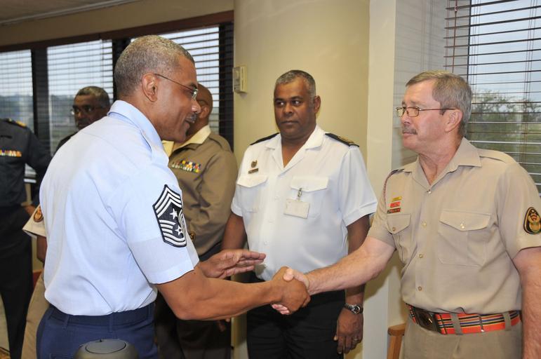 | Keywords: South African Senior Enlisted - SEAC visits Africom.jpg en PRETORIA SOUTH AFRICA -- Command Chief Master Sgt Jack Johnson U S Africa Command senior enlisted leader visited the South Africa SEAC and service senior enlisted advisors in Pretoria April 23 DoD photo by Army Master Sgt Terrence L Hayes CWO R P Narain WO Human Resources Division left 2012-04-24 00 58 23 http //www flickr com/photos/seac_jcs/7127989273/ Master Sgt Terrence L Hayes PD-USGov Uploaded with UploadWizard People of the South African Army Handshakes involving the military |