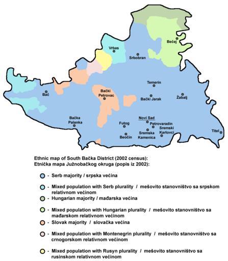 | Keywords: South backa ethnic2002.png en Ethnic map of South Bačka District - 2002 census data by settlements Етничка мапа Јужнобачког ок уга - попис из 2002 подаци по насељима ---- ;References Popis stanovništva domaćinstava i stanova u 2002 Stanovništvo nacionalna ili etnička pripadnost - Podaci po naseljima knjiga 1 Republika Srbija - Republički zavod za statistiku Beograd februar 2003 Slobodan Radovanović Geografski atlas Magic Map Smederevska Palanka 2001 Školski geografski atlas Intersistem Kartografija Beograd 2004 Denis Šehić - Demir Šehić Geografski atlas Srbije Beograd 2007 File Census 2002 Serbia ethnic map by localities png own PANONIAN 2009 Lõuna-Bačka rahvused png no legend PANONIAN South Bačka District Maps of districts of Vojvodina Demographic maps of Vojvodina Maps of the Serbs in Serbia Maps of the Hungarians Maps of the Slovaks Maps of the Montenegrins Maps of the Rusyns Maps in Serbian |