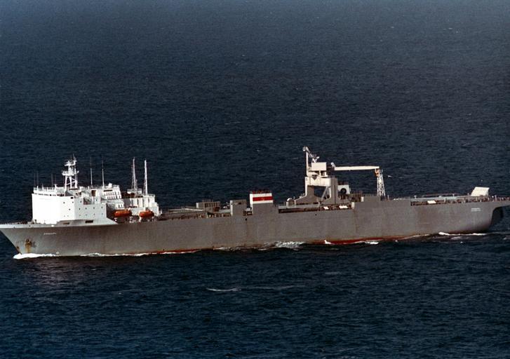 Keywords: Soviet Heavy lift ship Anadyr.jpeg A port view of the Soviet HEAVY LIFT cargo ship ANADYR underway The 741-foot 34 151-ton ship has a floodable docking well 419 feet long by 59 feet wide a 120-ton traveling crane and two helicopter hangars Up to 868 standard 20-foot containers can be stacked on portable panels atop the cargo well which has a 60-ton capacity ramp at the aft end to permit loading vehicle cargo Ship Built by Wartsila Helsinki Finland Date of launch 10 1982 Additional work by a Swedish yard Date of completion 1990 LPP 226 1 m Beam 30 m Draft 6 5 m DWT 12 765 GRT 34 151 Main engines 4x Wartisla Vasa 32 600 bhp Speed 20 kn History 1988 Named ANADYR Flag Russia 1996 Broken up parts used for a floating dock http //www defenseimagery mil; http //www defenseimagery mil/imagery html guid 028f1de4588b891b88c5c01554ba90fb144aa4d4 exact source for Still Image DN-SC-91-00451 1990-09-12 PH2 Stephen Grzezdzinski Anadyr ship 1990 PD-USGov-Military-Navy |