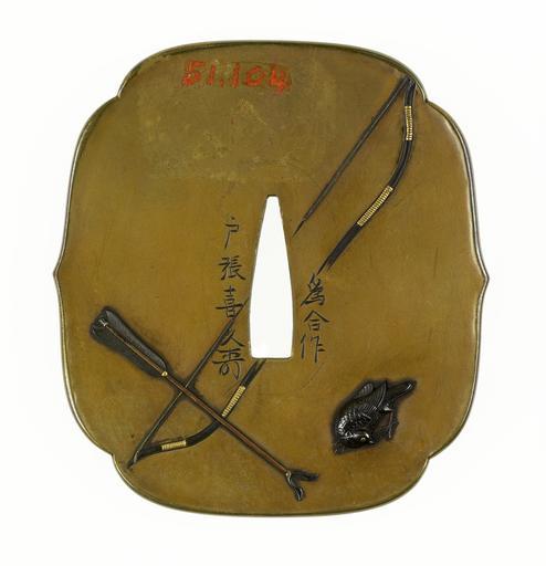| Keywords: Soyo - Tsuba with Marishiten and Atago Jizô - Walters 51104 - Back.jpg At the top of the tsuba are seven stars from the constellation Ursa Major The deity Marishiten was believed to reside in Ursa Major and she is depicted in the left cartouche Marishiten is shown standing on a running boar with a bow and arrow in her hands She has three heads and six arms She was worshipped by warriors in pre-modern Japan At the right is the deity Atago Jizô He is sometimes called Shogun Jizô and protected warriors This manifestation of Jizô can also be linked to Maritshiten because his animal messenger is the boar Gingko leaves and two pigeons are at the bottom On the reverse is another pigeon and a bow and arrow 2nd quarter 19th century late Edo-Meiji sentoku shibuichi copper gold cm 8 7 3 accession number 51 104 39682 Henry Walters Baltimore date and mode of acquistion unknown Walters Art Museum Henry Walters Acquired by Henry Walters Signature Nishin kore no zo/Soyo saku; Signature Shia u tsuku ru /Tobari Yoshihisa; Translation These are images of two deities/Made by Soyo; Translation Made together with Tobari Yoshihisa place of origin Edo present-day Tokyo Japan Walters Art Museum license Tsuba in the Walters Art Museum Media contributed by the Walters Art Museum needs category review Media contributed by the Walters Art Museum needs artist review |
