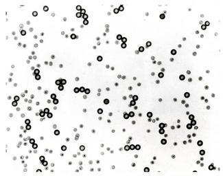 | Keywords: SpaceBeadsSRM 030.jpg A small area of a microscope slide shows human red blood cells along with the 10-micrometer spheres dark circles that were made in space NBS standard reference material SRM 1960 10-Micrometer Polystyrene Spheres is an inmportant tool for calibrating instruments to measure small particles such as blood cells National Institute of Standards and Technology National Institute of Standards and Technology PD-USGov-NIST PD-USGov National Bureau of Standards National Institute of Standards and Technology Space Beads |