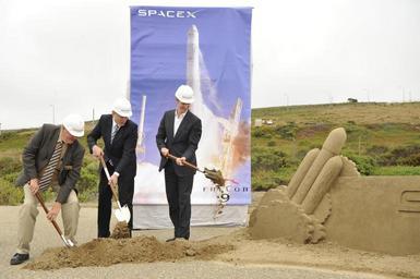 | Keywords: SpaceX breaks ground at Vandenberg Air Force Base.jpg  en VANDENBERG AIR FORCE BASE Calif -- Lompoc Mayor John Linn Elon Musk the founder and chief executive officer of SpaceX and California Lt Govenor Gavin Newsom shovel sand during the ground breaking ceremony at Space Launch Complex 4 East here Wednesday July 14 2011 SpaceX has plans to launch their Falcon Heavy from Vandenberg in 2013 U S Air Force photo/Staff Sgt Andrew Satran 2011-06-14 http //www vandenberg af mil/shared/media/photodb/photos/110713-F-CY114-073 jpg Staff Sgt Andrew Satran PD-USGov Uploaded with UploadWizard Elon Musk Ground-breaking ceremonies in the United States Falcon Heavy Vandenberg Air Force Base Space Launch Complex 4 |