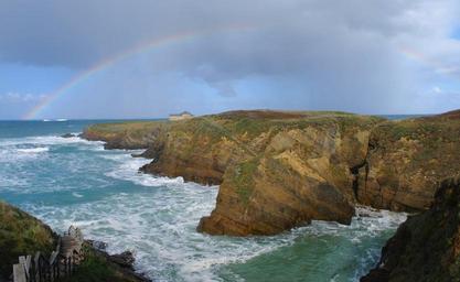 Keywords: spain coast coastline shoreline sky clouds sea ocean water waves surf tide cliffs crags formations country countryside beautiful scenic rainbow