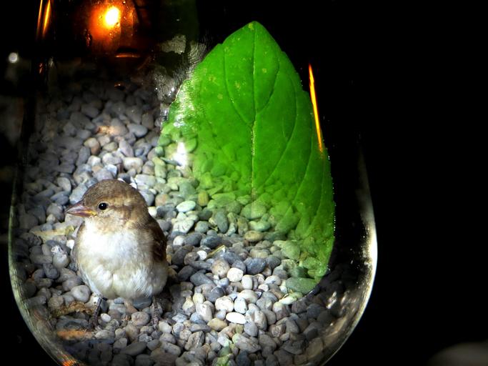 Keywords: sparrow sperling bird glass photo montage bird in the glass caught helpless confused fink sitting songbird animal cute pebble dark light