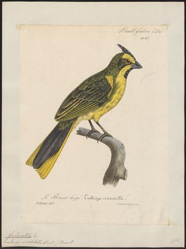 Keywords: Special Collections University of Amsterdam - Iconographia Zoologica - UBA01 IZ1207714 001 - Gubernatrix cristata Vieillot, 1817 - P. Oudart - G. Engelmann - Print - 1825-1834.tif Basis of record Artwork Scientific name Gubernatrix cristata Vieillot 1817 Catalog number UBA01_IZ1207714_001 Collection code ubainv274 Vertebrata Aves Passeres Linnaeus - Conirostres Cuvier Emberizidae A Newton - Emberizinae Bonaparte Gubernatrix Lesson Specific epithet cristata Infraspecific rank Infraspecific epithet Scientific name authorship Vieillot 1817 Nomenclatural code Kind of unit specimen Type status Life stage Individual count State or province Collection date Vieillot La galerie des oiseaux pl 67 nl De vogels zijn geordend volgens https //archive org/stream/handlistofgenera02britrich page/114/mode/2up G R Gray Hand-list of genera and species of birds 1869-1871 soortnummer 7714 en The birds have been arranged according to https //archive org/stream/handlistofgenera02britrich page/114/mode/2up G R Gray Hand-list of genera and species of birds 1869-1871 species number 7714 Number new box 63 Old name Gubernatrix cristatella Veillot Occurrence ID Institution Special Collections of the University of Amsterdam UvA-BC Source url http //dpc uba uva nl/inventarissen/ubainv274 Upcoming link as of July 2016 Title publication Author publication Subject keywords publication Publication location Document type Title artwork Creator Paul Louis Oudart artwork Groene kardinaal Yellow cardinal Medium artwork Print Dimensions artwork Size cm 33 25 Kind of unit artwork Subject keywords artwork Other versions artwork Permission license PD-old-100-1923 Iconographia Zoologica Images from the Special Collections of the University of Amsterdam Godefroy Engelmann Paul Louis Oudart Gubernatrix cristata