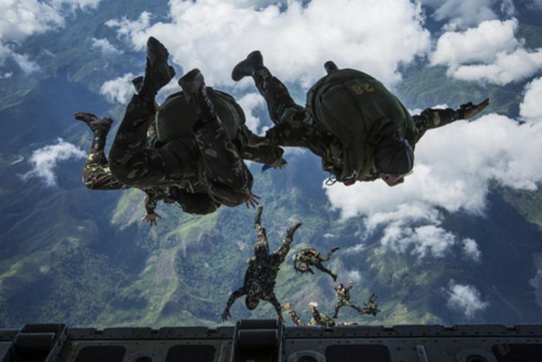 Keywords: Special Force.jpg en Philippine Army Special Forces freefall jumpers with Special Operations Command stationed at Fort Magsaysay jump from a KC-130J Sumos assigned to Marine Aerial Refueler Transport Squadron 152 Marine Aircraft Group 36 1st Marine Aircraft Wing based at Marine Corps Air Station Futenma Okinawa Japan during High Altitude Low Opening military freefall jumps during the Combined Arms Live Fire Exercise for Balikatan 2014 at Crow Valley Republic of the Philippines May 15 2014 This year marks the 30th iteration of Balikatan which is an annual Republic of the Philippines-U S military bilateral training exercise U S Marine Corps photo by Lance Cpl Allison DeVries/Released 2014-05-15 15 55 09 http //manila usembassy gov/balikatan-2014-gallery html US Embassy other versions PD-USGov Uploaded with UploadWizard Special forces of the Philippines |