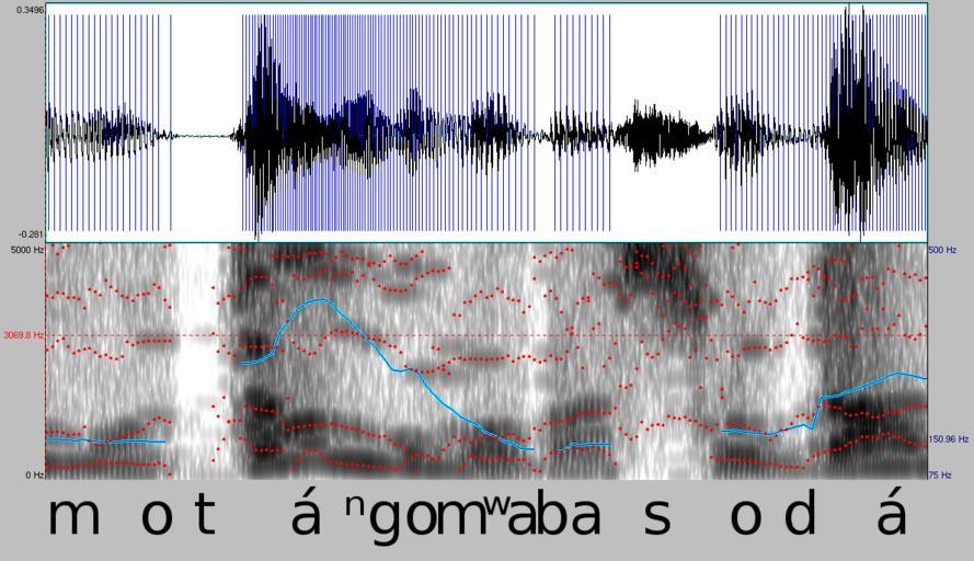 | Keywords: Spectrogram - motángo mwa basodá.png Spectrogram of Lingala motángo mwa basodá Standard lingala pronounced by a female speaker light blue line pitch dark blue lines pulses red dots formants made with Praat from a Radio Okapi news report 2007-04-23 Denis Jacquerye User Moyogo Voice spectrograms Formants Audio graphs Praat |