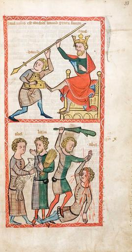 | Keywords: Speculum Darmstadt 2505 33r.jpg Speculum Humanae Salvationis Westfalen oder Köln um 1360 ULB Darmstadt Hs 2505 fol 33r http //tudigit ulb tu-darmstadt de/show/Hs-2505 ULB Darmstadt ~ 1360 anonymous PD-old-100 ULB Darmstadt Hs 2505 David and Saul David in miniature Cain and Abel Murder in art |