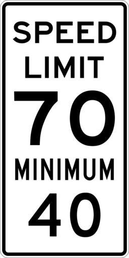 | Keywords: Speed limit 70 minimum 40 sign.svg 600 mm by 1200 mm 24 in by 48 in Combined Speed Limit sign made to the specifications of the http //mutcd fhwa dot gov/SHSm/regulatory pdf 2004 edition of Standard Highway Signs sign R2-4a Uses the http //www triskele com/fonts/index html Roadgeek 2005 fonts United States law does not permit the copyrighting of typeface designs and the fonts are meant to be copies of a U S Government-produced work anyway The outside border has a width of 1 1 mm and a color of black so it shows up; in reality signs have no outside border own Ltljltlj User Ltljltlj/Template R2-4 - Minimum Speed 7040 40 number 70 number |