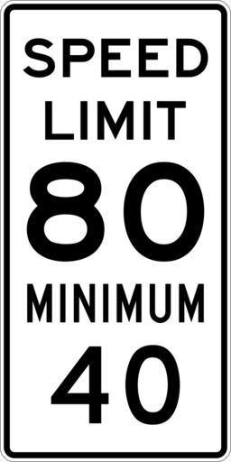 | Keywords: Speed Limit 80 Minimum 40 sign.svg 600 mm by 1200 mm 24 in by 48 in Combined Speed Limit sign made to the specifications of the http //mutcd fhwa dot gov/SHSm/regulatory pdf 2004 edition of Standard Highway Signs sign R2-4a Uses the http //www triskele com/fonts/index html Roadgeek 2005 fonts United States law does not permit the copyrighting of typeface designs and the fonts are meant to be copies of a U S Government-produced work anyway The outside border has a width of 1 1 mm and a color of black so it shows up; in reality signs have no outside border own Ltljltlj User Ltljltlj/Template minimum R2-4 - Minimum Speed 8040 40 number 80 number |