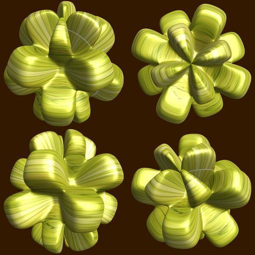 Keywords: mathematica cg 3d sphericalplot3d texture code program algorithm コード プログラム アルゴリズム geometric sculpture geometricsculpture shape geometry sculpture mapping テクスチャ マッピング 模様 もよう abstract 抽象 ちゅうしょう アブストラクト design pattern デザイン パターン graphic グラフィック グラフィクス structure 意匠 構造 symmetry 対称性 たいしょうせい シンメトリー 対称 たいしょう algorithm コード indoor organic pattern black background a = 2; b = 4; c = 4; SetOptions[SphericalPlot3D, Axes -> None, Mesh -> None, Boxed -> False, PlotStyle -> Directive[Specularity[White, 30], Texture[Import["D:/tmp/71.jpg"]]], TextureCoordinateFunction -> ({b #4, #5/c} &), Lighting -> "Neutral", Background -> Darker[Orange, 0.8], ImageSize -> 1600, PlotPoints -> 400]; f[v_] := Sin[2 Sin[Sin[Sin[v]]]]; SphericalPlot3D[a + f[b p] f[c q], {p, 0, Pi}, {q, 0, 2 Pi}] (*--- The Texture *) a = 2; b = 4; c = 4; SetOptions[SphericalPlot3D, Axes -> None, Mesh -> None, Boxed -> False, PlotStyle -> Directive[Specularity[White, 30], Texture[Import["D:/tmp/71.jpg"]]], TextureCoordinateFunction -> ({b #4, #5/c} &), Lighting -> "Neutral", Background -> Darker[Orange, 0.8], ImageSize -> 1600, PlotPoints -> 400]; f[v_] := Sin[2 Sin[Sin[Sin[v]]]]; SphericalPlot3D[a + f[b p] f[c q], {p, 0, Pi}, {q, 0, 2 Pi}] (*--- The Texture *) |