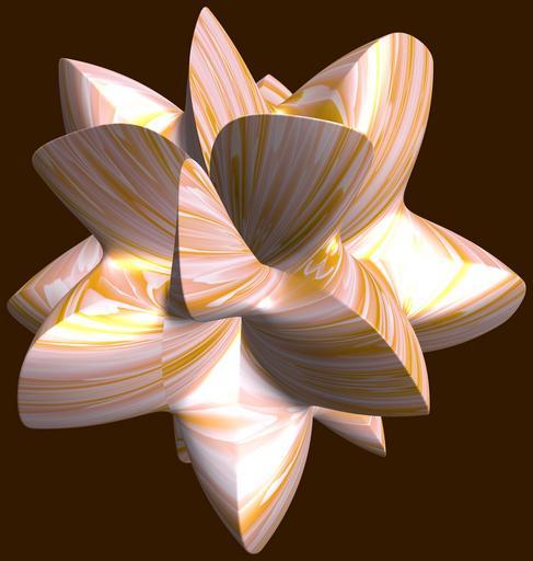 Keywords: mathematica cg 3d sphericalplot3d texture code program algorithm コード プログラム アルゴリズム geometric sculpture geometricsculpture shape geometry sculpture mapping テクスチャ マッピング 模様 もよう abstract 抽象 ちゅうしょう アブストラクト design pattern デザイン パターン graphic グラフィック グラフィクス structure 意匠 構造 symmetry 対称性 たいしょうせい シンメトリー 対称 たいしょう algorithm コード black background a = 0.5; b = 4; c = 2; SetOptions[SphericalPlot3D, Axes -> None, Mesh -> None, Boxed -> False, PlotStyle -> Directive[Specularity[White, 30], Texture[Import["D:/tmp/861.jpg"]]], TextureCoordinateFunction -> ({b #4, #5/c} &), Lighting -> "Neutral", Background -> Darker[Orange, 0.8], ImageSize -> 1600, PlotPoints -> 400]; f[v_] := TriangleWave[{-1, 1}, v/Pi]/3; g[v_] := Sin[2 Sin[Sin[Sin[v]]]]; SphericalPlot3D[a + g[b p] f[c q], {p, 0, Pi}, {q, 0, 2 Pi}] (*--- The Texture *) a = 0.5; b = 4; c = 2; SetOptions[SphericalPlot3D, Axes -> None, Mesh -> None, Boxed -> False, PlotStyle -> Directive[Specularity[White, 30], Texture[Import["D:/tmp/861.jpg"]]], TextureCoordinateFunction -> ({b #4, #5/c} &), Lighting -> "Neutral", Background -> Darker[Orange, 0.8], ImageSize -> 1600, PlotPoints -> 400]; f[v_] := TriangleWave[{-1, 1}, v/Pi]/3; g[v_] := Sin[2 Sin[Sin[Sin[v]]]]; SphericalPlot3D[a + g[b p] f[c q], {p, 0, Pi}, {q, 0, 2 Pi}] (*--- The Texture *) |